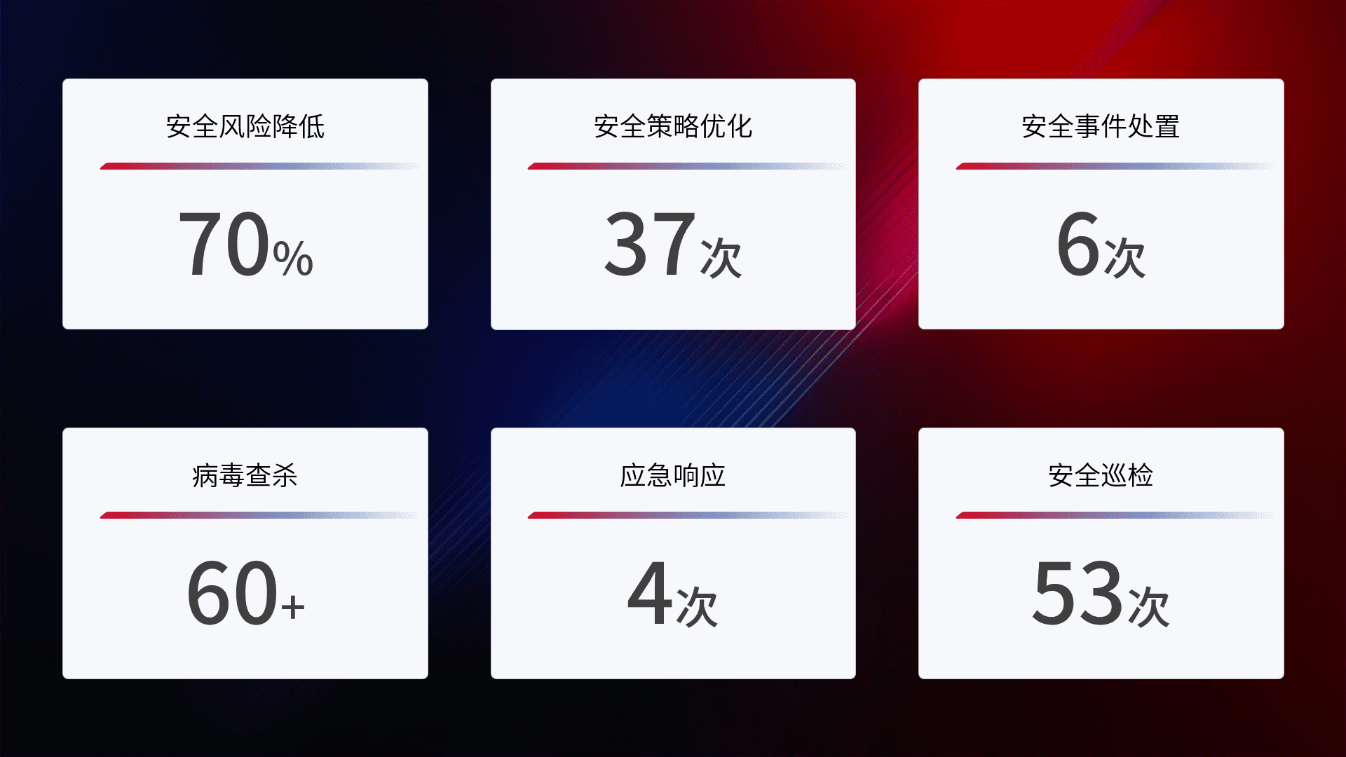 提供全面的安全事件报告体系,,,,包括处置报告、、、、周报、、、、季度和年度总结,,,,结合持续监控,,帮助客户深入了解网络安全状况。。