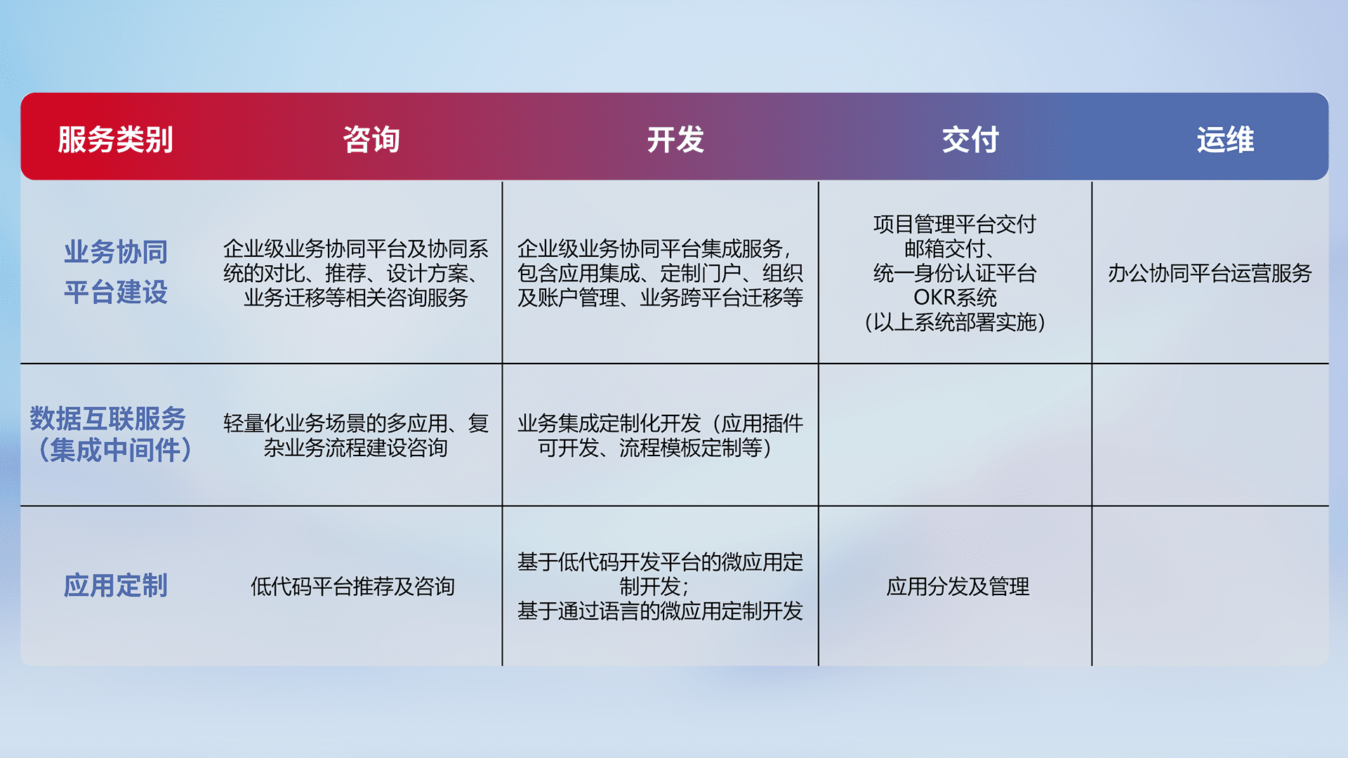 针对钉钉、、、企微、、IDaas等平台级产品提供产品的规划、、、、方案、、、交付、、、、定制化开发等服务,,,,实现如统一协同办公、、智能客户服务、、、混合会议管理、、、智能数据查询、、等业务场景,,,实现数字化转型。。。
